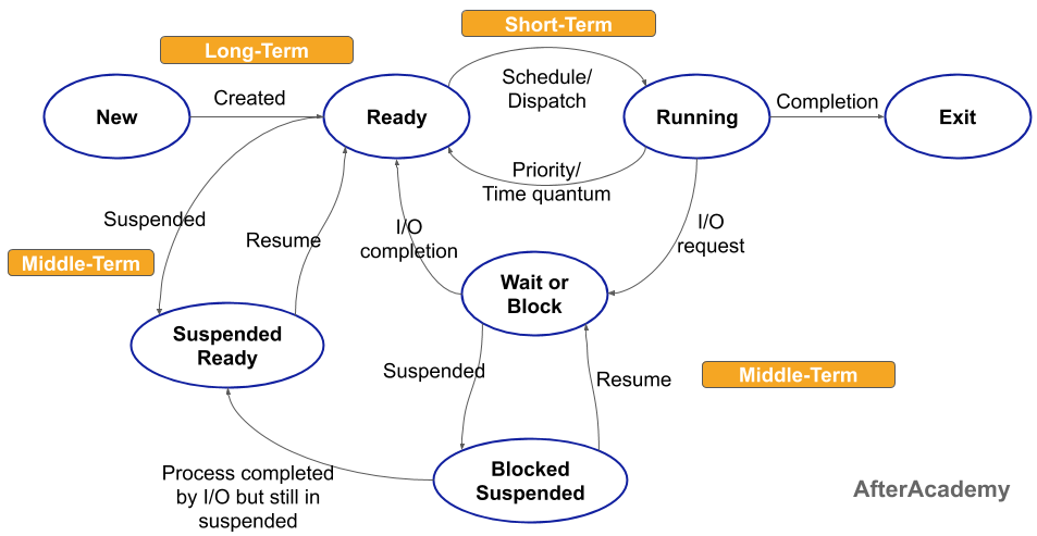 - ex) 사용자가 프로그램을 일시 정지시킨 경우, 시스템이 여러 이유로 프로세스를 잠시 중단시킨 경우(메모리에 너무 많은 프로세스가 올라와 있을 때)