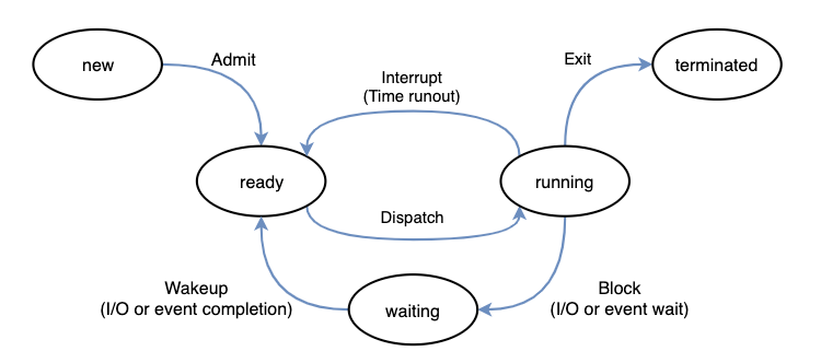- Blocked(wait, sleep) : CPU를 주어도 당장 instruction을 수행할 수 없는 상태. Process가 자신이 요청한 event가 만족되지 않아 이를 기다리고 있는 상태.