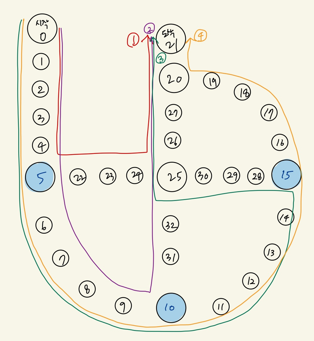 1. 윷놀이 판을 위와 같이 새롭게 세팅해준다. 윷놀이 판에서 이동 가능한 다음 4가지 경로에 대해서 말이 이동할 수 있도록 map[] 배열에 이동 칸의 인덱스를 저장해준다. turn[] 배열에는 5, 10, 15의 파란색 칸에 대해서 방향 전환이 이뤄질 수 있도록 전환 후 이동 칸 인덱스를 저장한다. score[] 배열에는 각 칸의 점수를 저장한다.