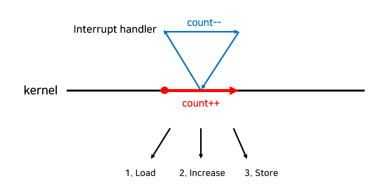 kernel에서 count 값 Load 후 인터럽트가 발생 (ex. count 10) -> 인터럽트 핸들러가 count 값 감소시킴 (ex. count 9) -> kernel은 원래 읽어들였던 count 값 (ex. count 10)을 증가시킨 후 저장함 (ex. count 11)