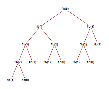 이를 그림으로 표현하면 다음과 같이 fib(5)를 구하기 위해 fib(2), fib(3) 등의 부문제의 계산을 여러번 반복해야 함을 확인할 수 있다. 이러한 문제를 극복하고 효율성을 높이기 위해 동적프로그래밍이 고안되었다.