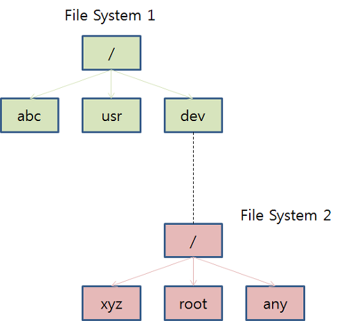 실제로는 다른 disk에 있어도 사용자는 하나의 system으로 느낌. 파일시스템의 확장.