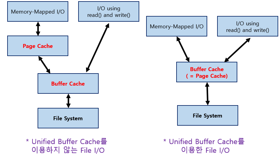 - 최근의 OS에서는 기존의 buffer cache가 page cache에 통합됨