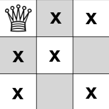 Queen은 체스에서 다음과 같이 x 표시한 위치로 이동 가능한 기물이다. Queen이 위치한 좌표를 (1,1)이라고 하면, (2,1), (2,2) 등 x표시가 된 좌표는 퀸을 놓을 수 없는 위치이다. (2,3), (3,2) 등은 퀸을 놓을 가능성이 있는 위치이다. 만약 dfs를 한다면 모든 좌표의 지점을 검사하여 수많은 연산을 했겠지만, 백트래킹의 핵심은 가지치기에 있으므로 가능성이 없는 위치는 검사하지 않도록 해야한다.