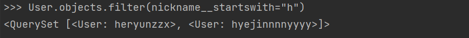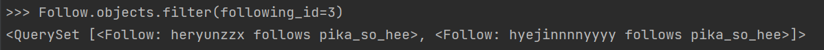 - filter()는 새로운 쿼리셋 생성 후, 필터 조건에 부합하는 객체들을 넣은 후 리턴. (필터 조건에 부합하는 객체가 없다면 빈 쿼리셋 반환)