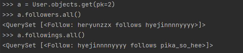 - related_name 이용해서 user의 follwers(user를 follow하는 관계), followings(user가 follow하는 관계) 조회